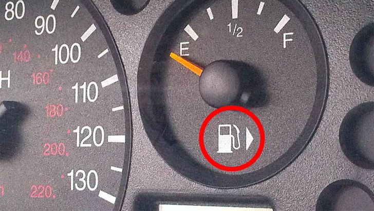 - La petite flèche à côté du symbole d’une pompe à essence à proximité de la jauge de carburant