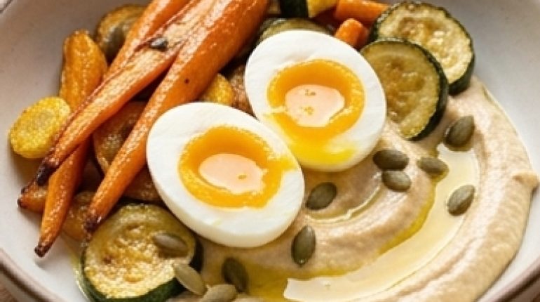 📌 Bowl houmous, œufs mollets et légumes rôtis : le repas complet qui se prépare à l’avance