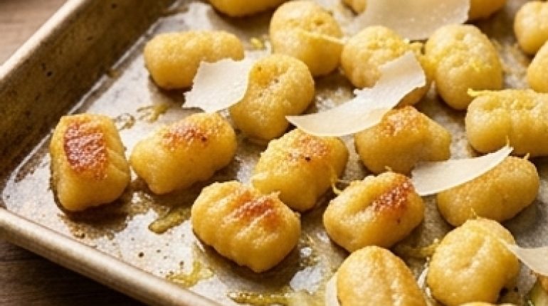 - Les gnocchis en paquet (rayon épicerie sèche) — Surtout pas les gnocchis frais du rayon réfrigéré pour cette recette — leur humidité les fait vaporer au lieu de rôtir. Les gnocchis secs, ceux en paquet au rayon pâtes, ont l’air moins nobles mais c’est exactement eux qui vont devenir croustillants sur les bords.