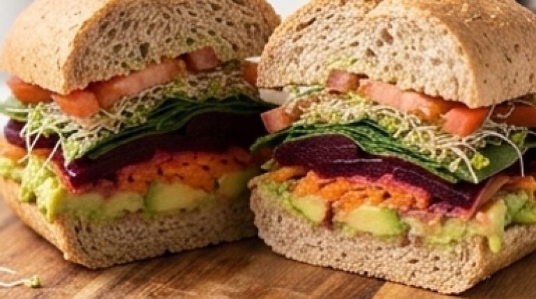 Un sandwich végétarien. On voit déjà la chose : du pain mou, une rondelle de tomate qui glisse, quelques feuilles de laitue sans goût, et cette impression de manger une punition. Ce sandwich-là fonctionne à l’opposé exact de cette idée, parce que chaque composant est assaisonné avant même d’entrer dans le pain.