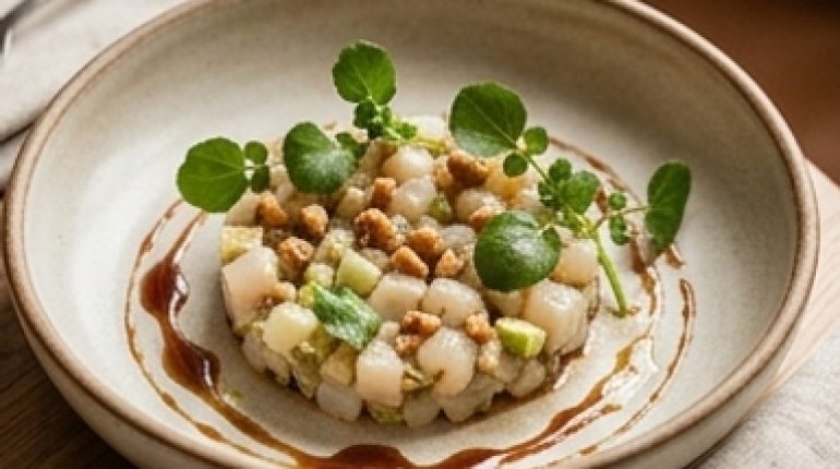📌 Tartare de Saint-Jacques aux artichauts, pomme verte et réduction de jus de pomme